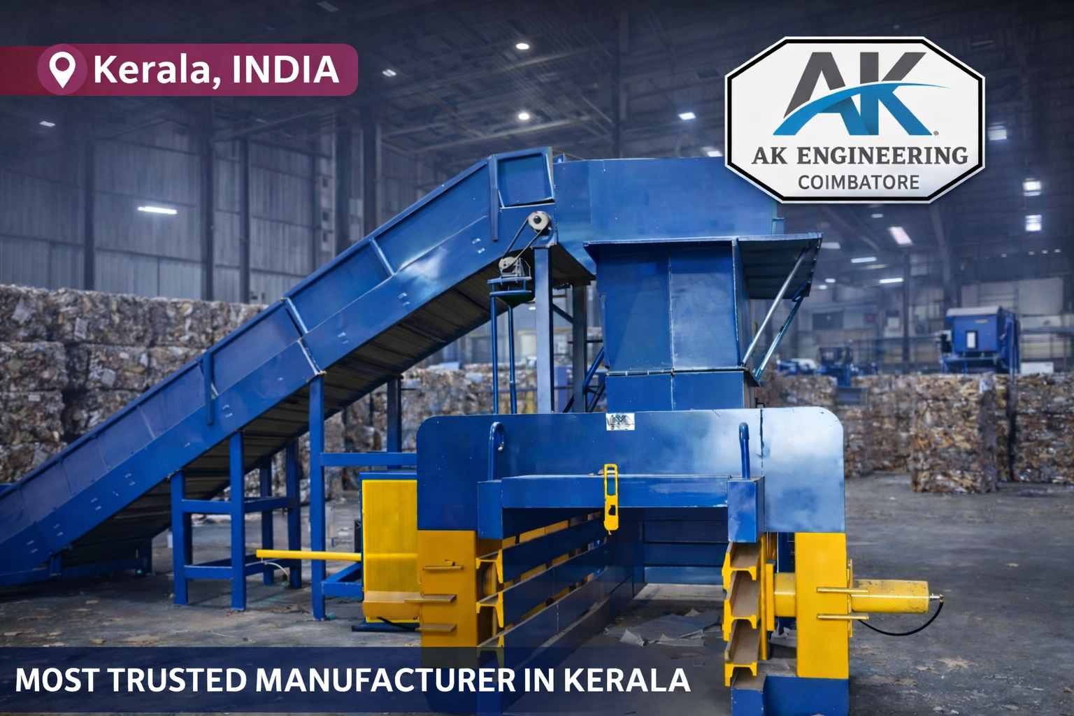 1000kg Fully Automatic Horizontal Hydraulic Baling Machine for Waste Paper, Plastic & Cardboard The 1000kg Fully Automatic Horizontal Hydraulic Baling Machine is a powerful and reliable solution for compressing waste paper, plastic, and cardboard, engineered for high-volume recycling operations. Designed for continuous industrial use, this machine delivers strong hydraulic compression, uniform bale formation, and consistent output, ensuring efficient waste handling and reduced logistics costs. Manufactured by AK Engineering, India’s trusted baling machine manufacturer from Kerala, this heavy-duty baler features robust steel construction, advanced hydraulic technology, and PLC-based fully automatic operation. The integrated auto tying system minimizes manual effort while enhancing safety, productivity, and operational efficiency. Ideal for recycling plants, scrap yards, warehouses, paper mills, and municipal waste management units, the machine is built to withstand demanding working conditions with low maintenance requirements and long service life. Its energy-efficient design supports sustainable waste management while maximizing return on investment. Manufactured by AK Engineering – India’s Trusted Baling Machine Manufacturers from Kerala
