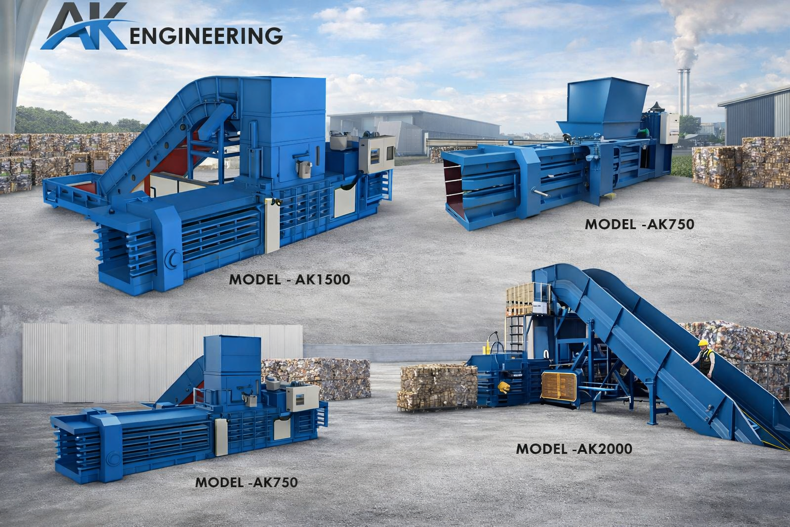 1000kg Fully Automatic Horizontal Hydraulic Baling Machine for Waste Paper, Plastic & Cardboard The 1000kg Fully Automatic Horizontal Hydraulic Baling Machine is a powerful and reliable solution for compressing waste paper, plastic, and cardboard, engineered for high-volume recycling operations. Designed for continuous industrial use, this machine delivers strong hydraulic compression, uniform bale formation, and consistent output, ensuring efficient waste handling and reduced logistics costs. Manufactured by AK Engineering, India’s trusted baling machine manufacturer from Kerala, this heavy-duty baler features robust steel construction, advanced hydraulic technology, and PLC-based fully automatic operation. The integrated auto tying system minimizes manual effort while enhancing safety, productivity, and operational efficiency. Ideal for recycling plants, scrap yards, warehouses, paper mills, and municipal waste management units, the machine is built to withstand demanding working conditions with low maintenance requirements and long service life. Its energy-efficient design supports sustainable waste management while maximizing return on investment. Manufactured by AK Engineering – India’s Trusted Baling Machine Manufacturers from Kerala
